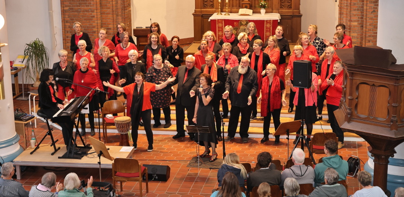 Seit dem 12.März 2019 singen wir mit Begeisterung Gospels unter der Leitung von Renate Henke. Mit ca. 90 Sängerinnen und Sängern startete der Chor. Schon am 22.09.2019 begleitete der Chor den ersten Gottesdienst in der Kirchengemeinde St. Martin in Nortorf. 300 Besucher klatschten, sangen und swingten begeistert mit. Weitere Auftritte in der St. Martin Kirche folgten bis Anfang März 2020.